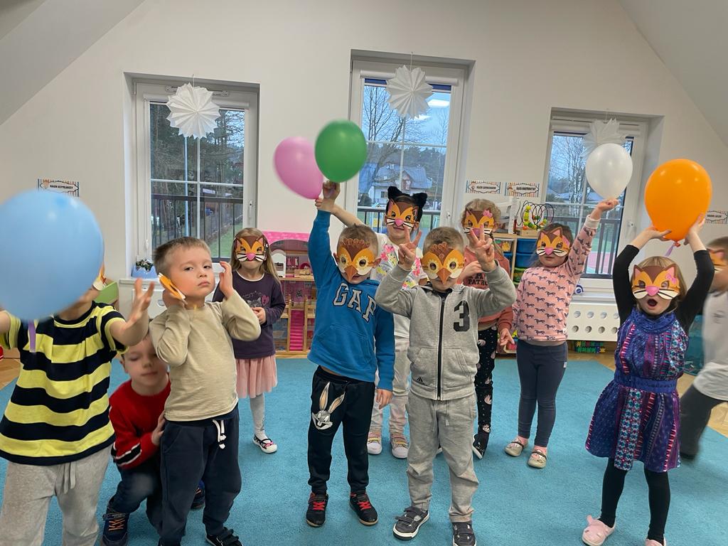 Na zakończenie tygodnia rozwiązywały zagadki karnawałowe, poznały pojęcie,, taniec", rozwijały umiejętności ruchu z muzyką. Uwieńczeniem tematu były wykonane przez dzieci maski karnawałowe kotka i sowy ![]()