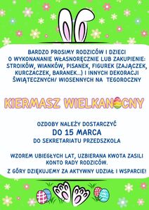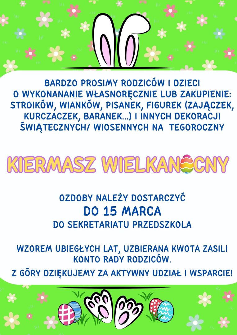 Kiermasz wielkanocny w przedszkolu Wielkimi, jak skoki zająca, krokami przygotowujemy się do Kiermaszu Wielkanocnego!Dlatego zwracamy się do Państwa z prośbą o zaangażowanie - szczegóły poniżej Zdjęcia Zobacz również I Powiatowy konkurs ortograficzny Walentynki Zebranie Rady Rodziców Szkoły Kiermasz wielkanocny w przedszkolu Rekrutacja do przedszkoli i szkół na rok szkolny... Samorząd Uczniowski zaprasza 09 marca 2024 Komunikaty Wydrukuj Udostępnij Wyświetlono: 113