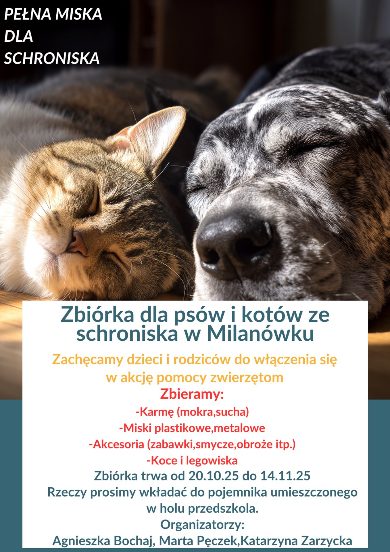 Zbiórka na schronisko dla zwierząt w Milanówku Serdecznie zapraszamy do wzięcia udziału w ważnej akcji charytatywnej na rzecz Schroniska dla zwierząt w Milanówku. Pojemnik na potrzebne rzeczy jest wystawiony w holu głównym w naszym przedszkolu Zdjęcia Zobacz również 23.10 - dzień otwarty 10 listopada - dniem wolnym w przedszkolu 10.11 - dzień wolny od zajęć dydaktyczno-wychowawczych Zbiórka na schronisko dla zwierząt w Milanówku 7. edycja akcji "Szkoła z pozytywną uwagą" Święto Szkoły - Festiwal piosenki patriotycznej 09 listopada 2025 Komunikaty Wydrukuj Udostępnij Wyświetlono: 19