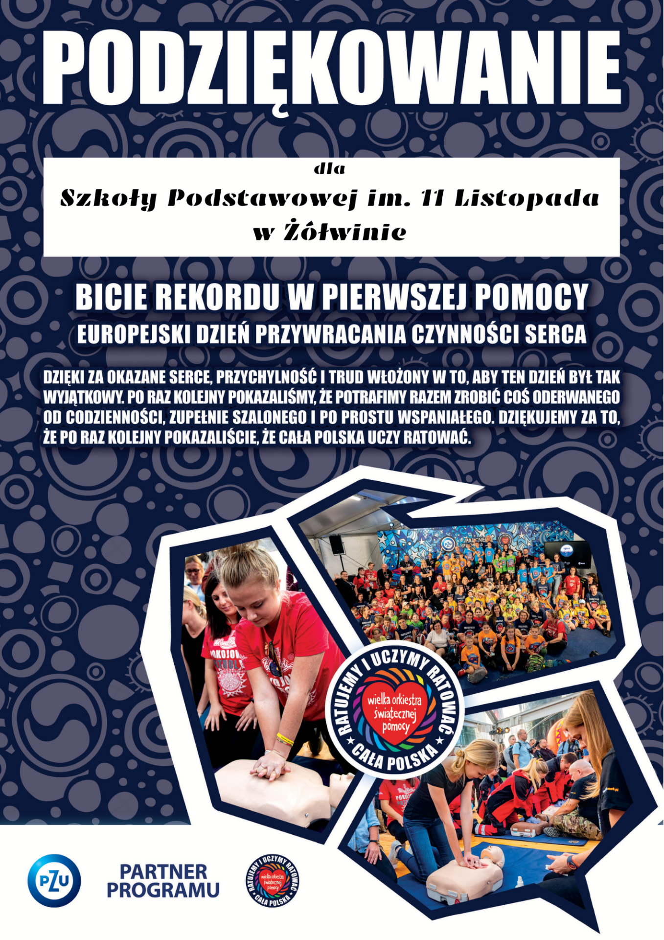 16 października wzięliśmy udział w akcji zainicjowanej przez WOŚP, a służącej upowszechnianiu wiedzy o pierwszej pomocy. Jest to data, kiedy obchodzimy Europejski Dzień Przywracania Czynności Serca, ustanowiony w 2013 roku. Samo wydarzenie łączy wiedzę z dobrą zabawą - polega na prowadzeniu resuscytacji krążeniowo-oddechowej na fantomie przez 30 minut. W naszej szkole zaangażowane były klasy IV i klasa VIb - łącznie 60 uczniów i nauczyciele im towarzyszący. Dla dzieciaków był to dobry moment, by przypomnieć sobie zasady, poćwiczyć. Jeszcze raz skorzystaliśmy też ze szkoleniowego AED, bo ważne jest, by czuć się pewnie w trudnych sytuacjach i umieć udzielić pomocy.