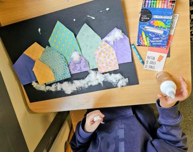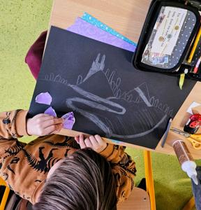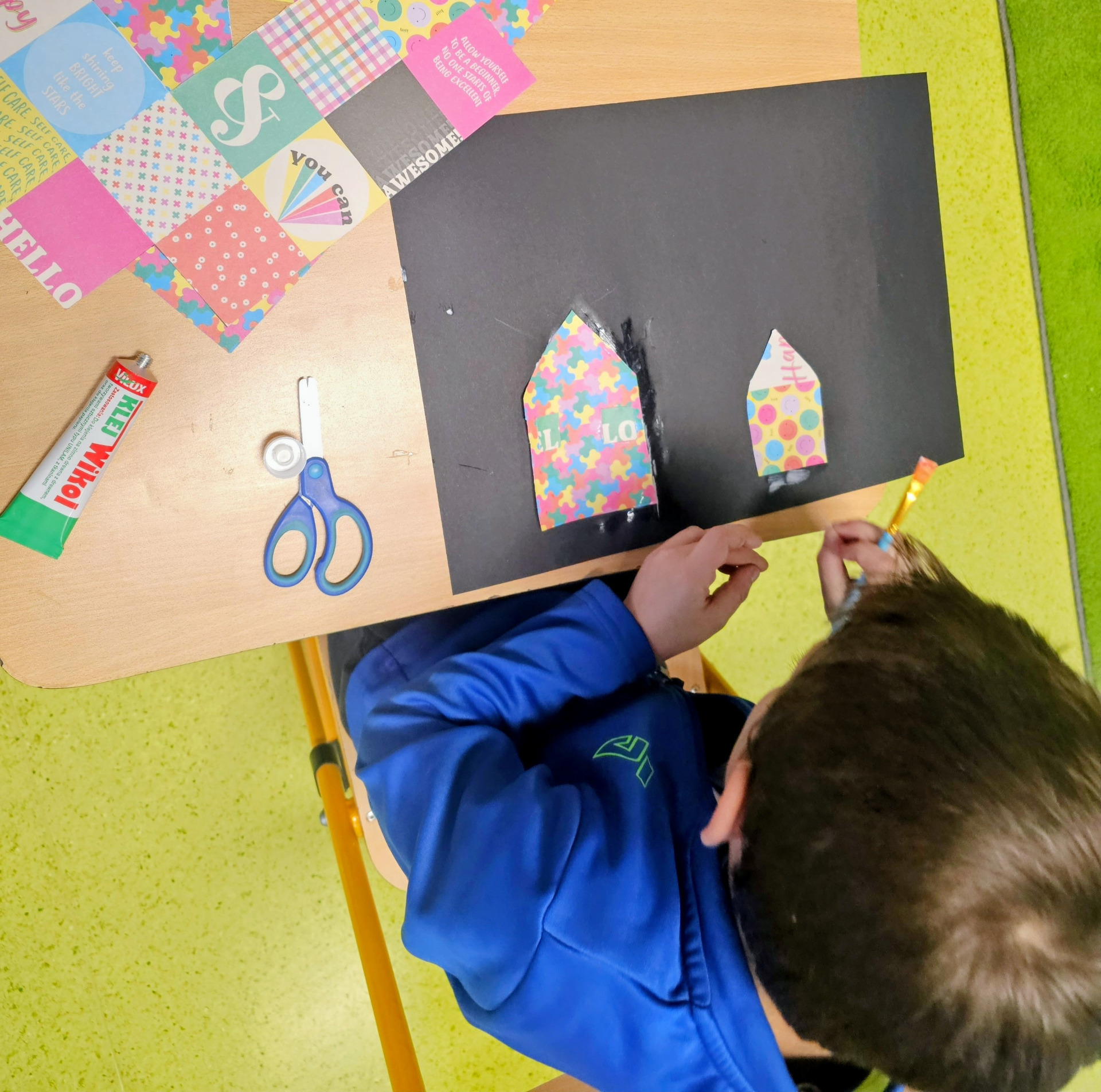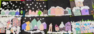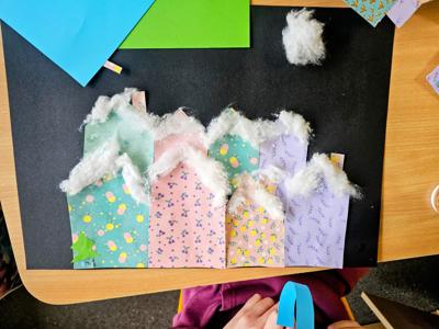Na zajęciach kreatywnych uczniowie z klasy 2b wykonali zimowe miasteczko nocą.Kolorowe domki z papieru kreatywnego wydają się świecić na tle głębokiej zimowej nocy.To nie tylko praca plastyczna, ale mała instalacja świetlna, w której biel i kolor walczą z ciemnością, tworząc niesamowicie klimatyczny i wyrazisty efekt.Idealne odwzorowanie magicznej zimowej nocy otulonej miękkim śniegiem.