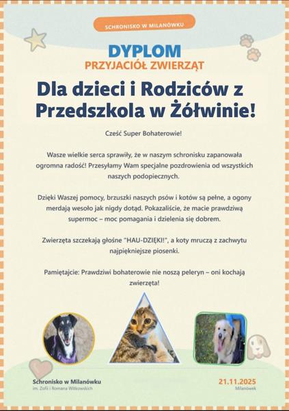 22 listopada 2025 Aktualności Przedszkole w Żółwinie Przedszkolaki pomagają czworonogom ze schroniska W sobotę 22 listopada odwiedziliśmy Schronisko dla Bezdomnych Zwierząt im. Zofii i Romana Witkowskich, aby przekazać wszystkie zebrane dary w naszym przedszkolu podczas " Naszej Akcji". Dzięki ogromnemu... Czytaj więcej