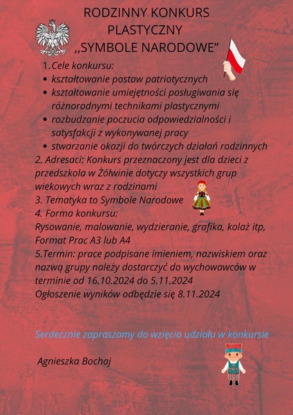 17 października 2024 Komunikaty Przedszkole w Żółwinie Rodzinny konkurs plastyczny "Symbole narodowe" Listopad coraz bliżej, dlatego mamy dla Państwa propozycję rodzinnego konkursu plastycznego dotyczącego symboli narodowych. Zachęcamy do udziału! Czytaj więcej