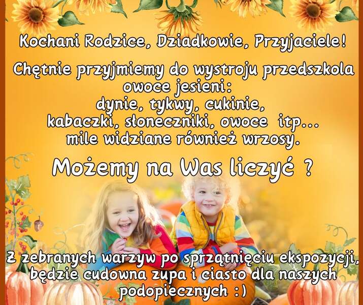 11 września 2024 Komunikaty Przedszkole w Żółwinie Jesienny wystrój przedszkola Zwracamy się do Państwa z prośbą o współudział w dekorowaniu przedszkola Wymienione niżej produkty można przynosić do końca przyszłego tygodnia (tj. 20.09.). Skrzynka na ,,skarby... Czytaj więcej