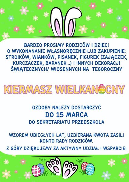 09 marca 2024 Komunikaty Przedszkole w Żółwinie Kiermasz wielkanocny w przedszkolu Wielkimi, jak skoki zająca, krokami przygotowujemy się do Kiermaszu Wielkanocnego!Dlatego zwracamy się do Państwa z prośbą o zaangażowanie - szczegóły poniżej Czytaj więcej